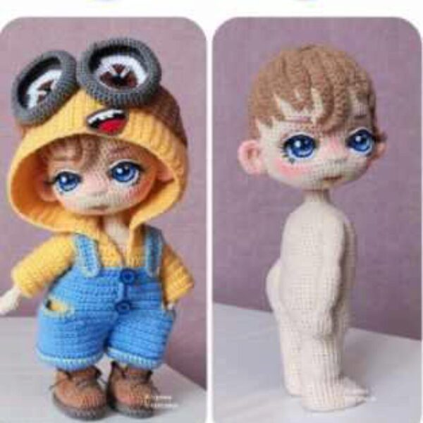 Высота 22 см. Голова поворачивается, ручки, ножки, шея сгибаются. Комбинезон и обувь съёмные.
