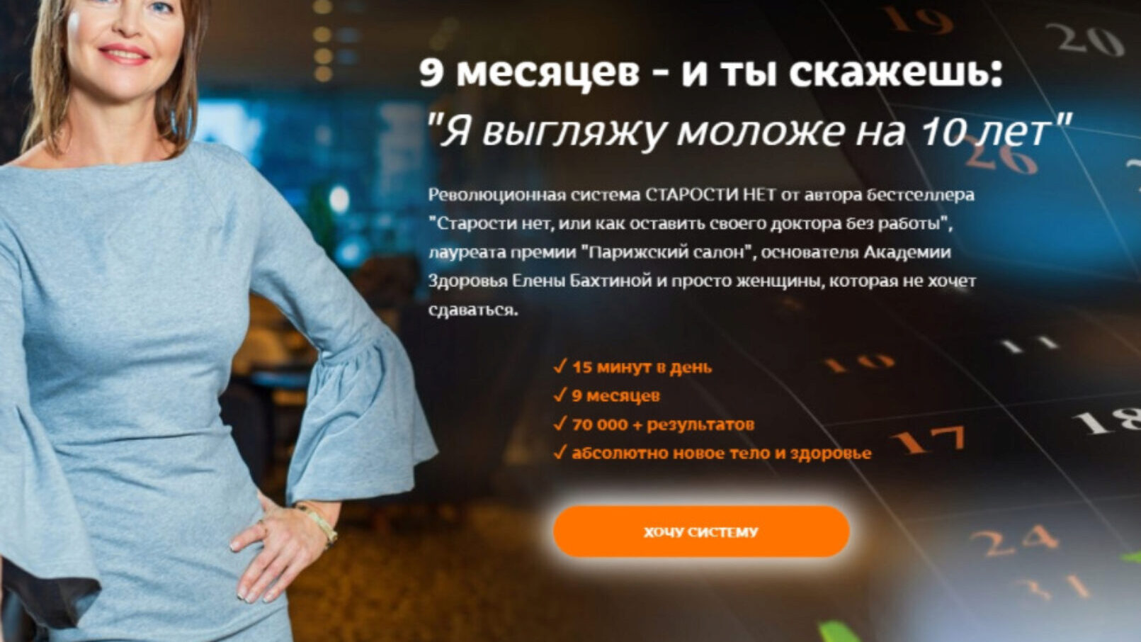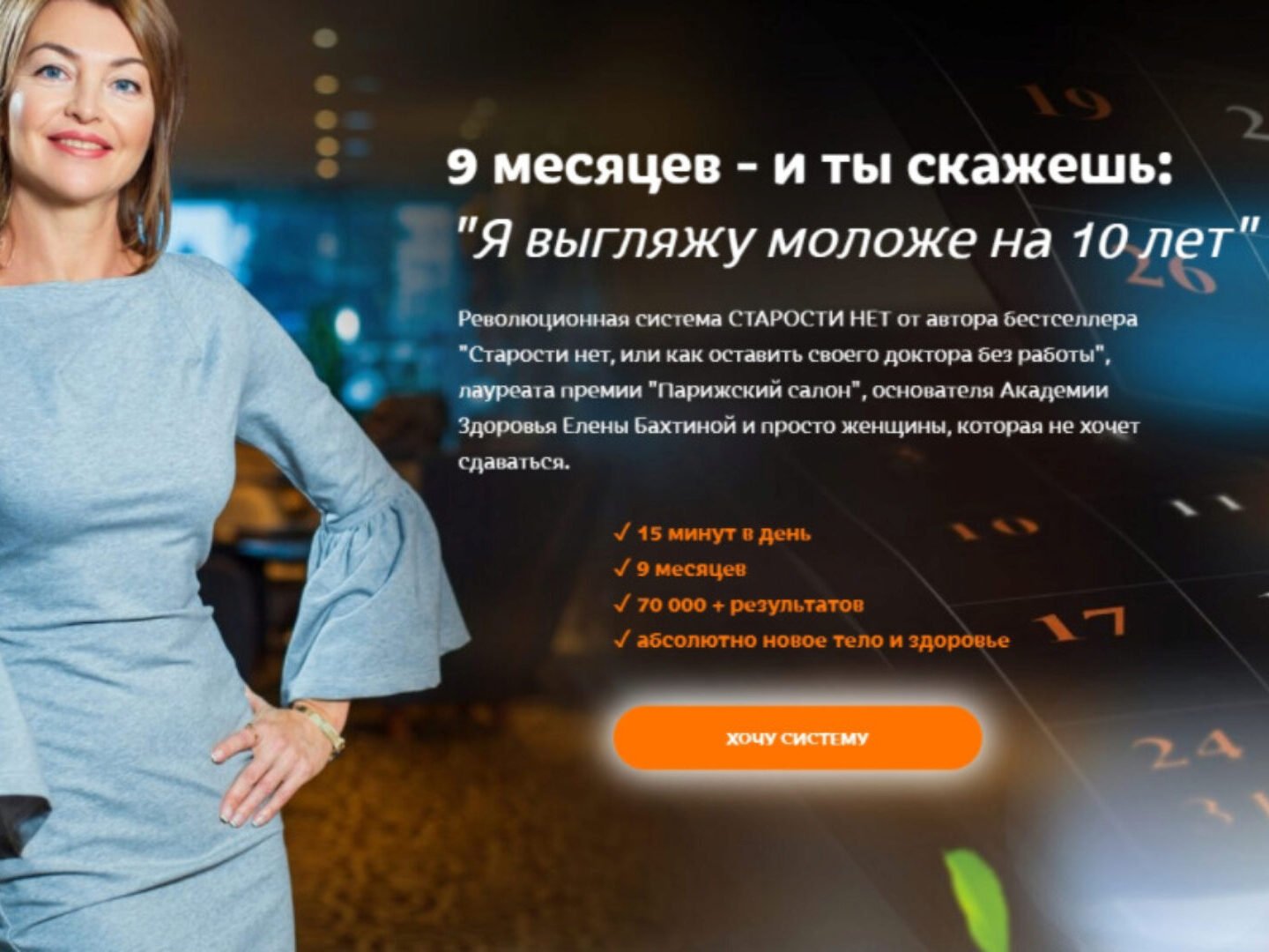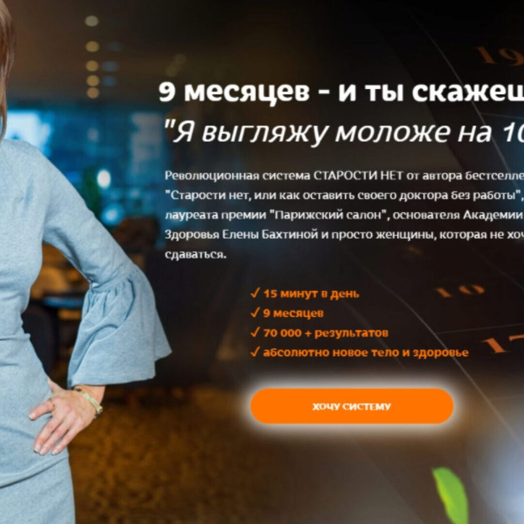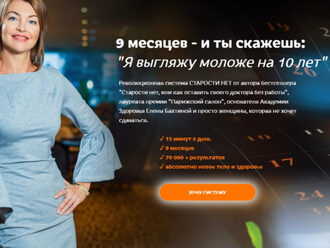 9 месяцев - и ты скажешь: «Я выгляжу моложе на 10 лет» 15 минут в день 9 месяцев 70 000 + результатов абсолютно новое тело и здоровье Революционная система СТАРОСТИ НЕТ от автора бестселлера «Старости нет, или как оставить своего доктора без работы», лауреата премии «Парижский салон», основателя