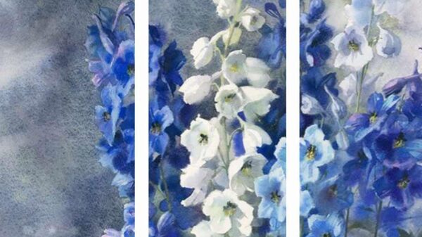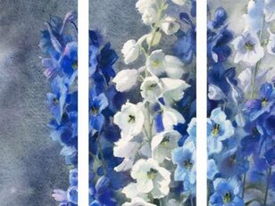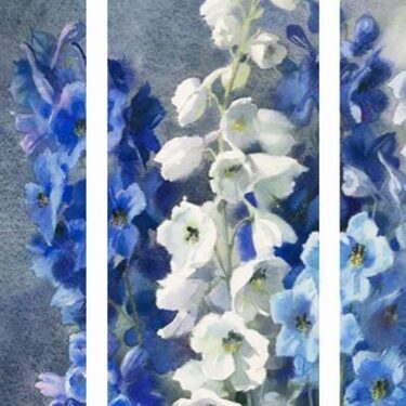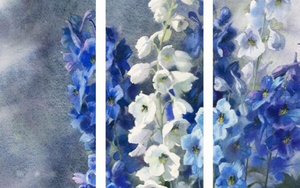 Конструкция цветков дельфиниума необычна. Крупные вертикальные соцветия сложно компонуются, и кажется невероятно сложно их изобразить. Однако Елена Базанова уверена, что все желающие смогут решить все поставленные задачи и напишут этюд дельфиниумов, следуя объяснениям автора.
