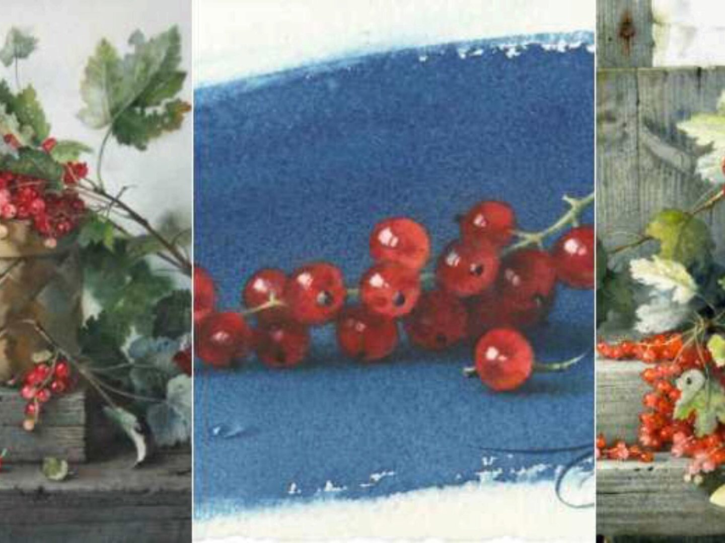 Также вы продолжите изучать секреты смешения красок: как писать чистые яркие красные сочетания в ягодах и как писать зеленые листья без зеленых красок.