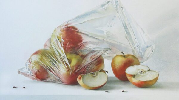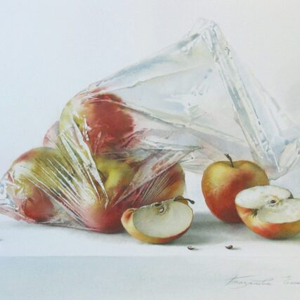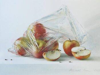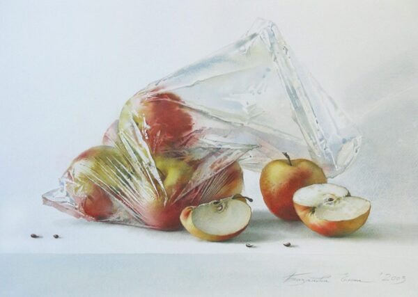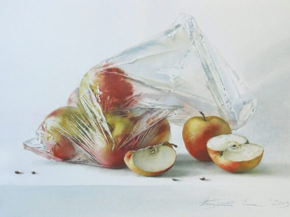 - На занятии «Яблоки в полиэтиленовом пакете» мы напишем натюрморт в манере, уже знакомой многим участникам других практик автора. Живопись по-мокрому и по-сухому одновременно, и, конечно, лессировки.