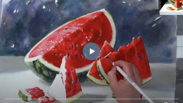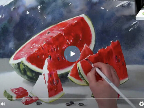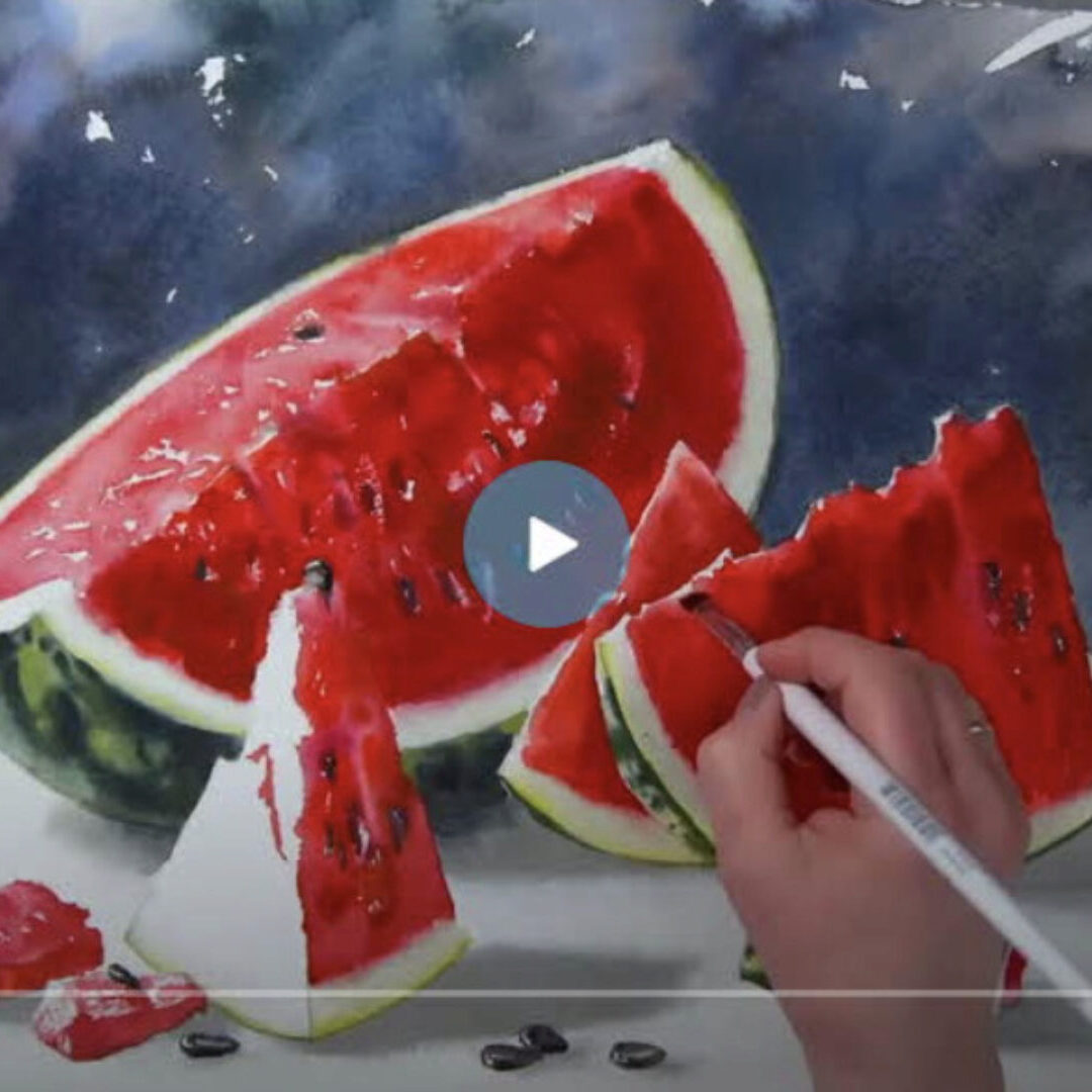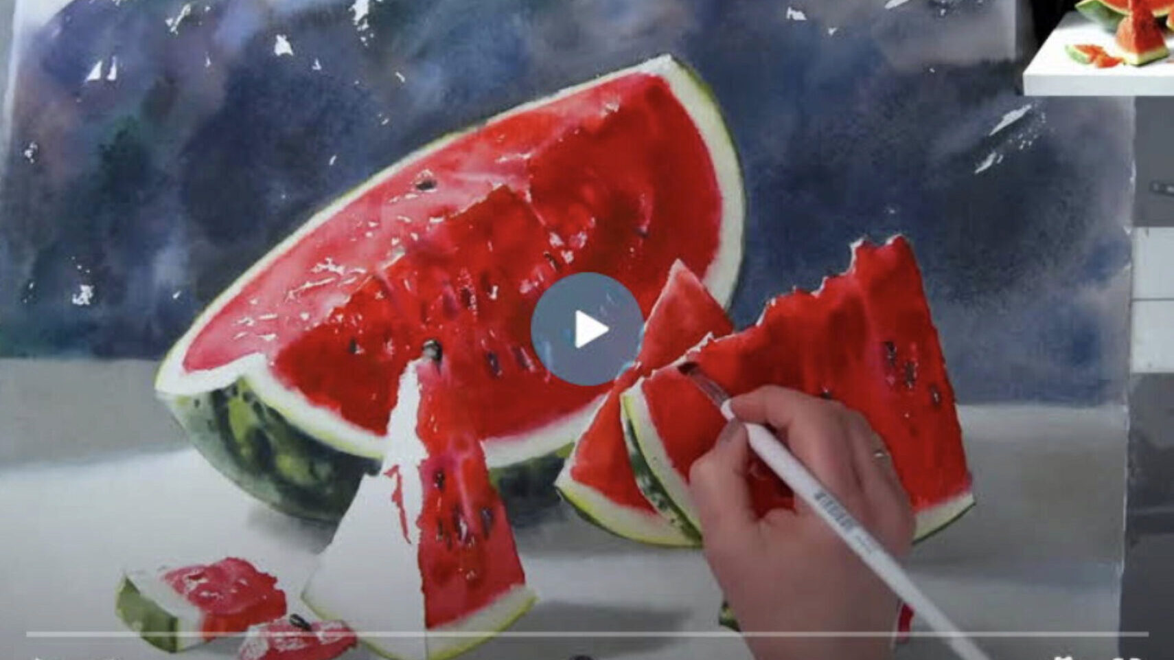 На мастер-классе «Живопись натюрморта с арбузом акварелью» Елена щедро делится секретами написания арбуза, дает упражнения, подробные объяснения по композиции в эскизах,