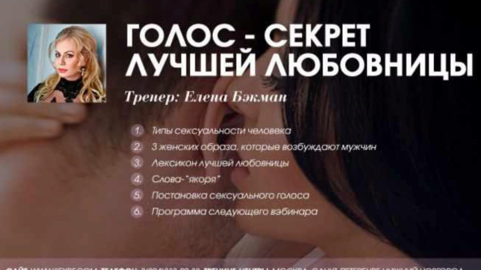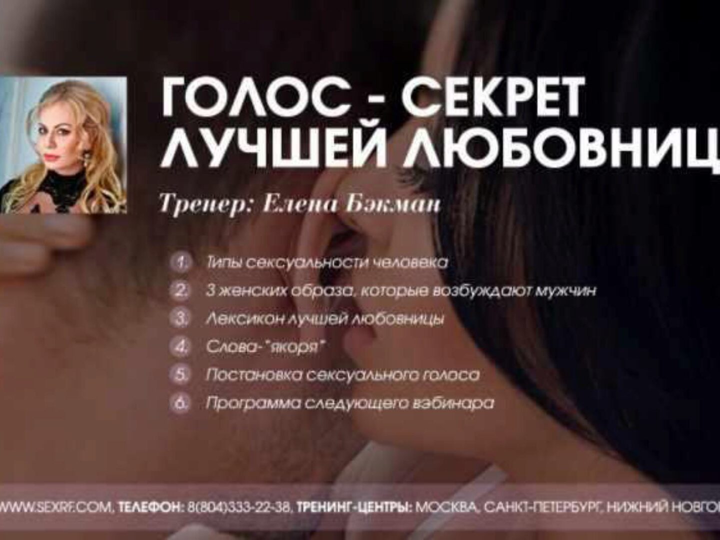 Научим управлять своей речью и интонацией так, что Вы сможете очаровывать мужчин с помощью своего голоса. О ЧЕМ ПОГОВОРИМ НА ТРЕНИНГЕ 1 - ГОЛОС Какой голос нравится мужчинам. Как голос сделать вдохновляющим, запоминающимся, очаровательным. 2 - ИНТОНАЦИЯ С какой интонацией можно просить мужчину так,