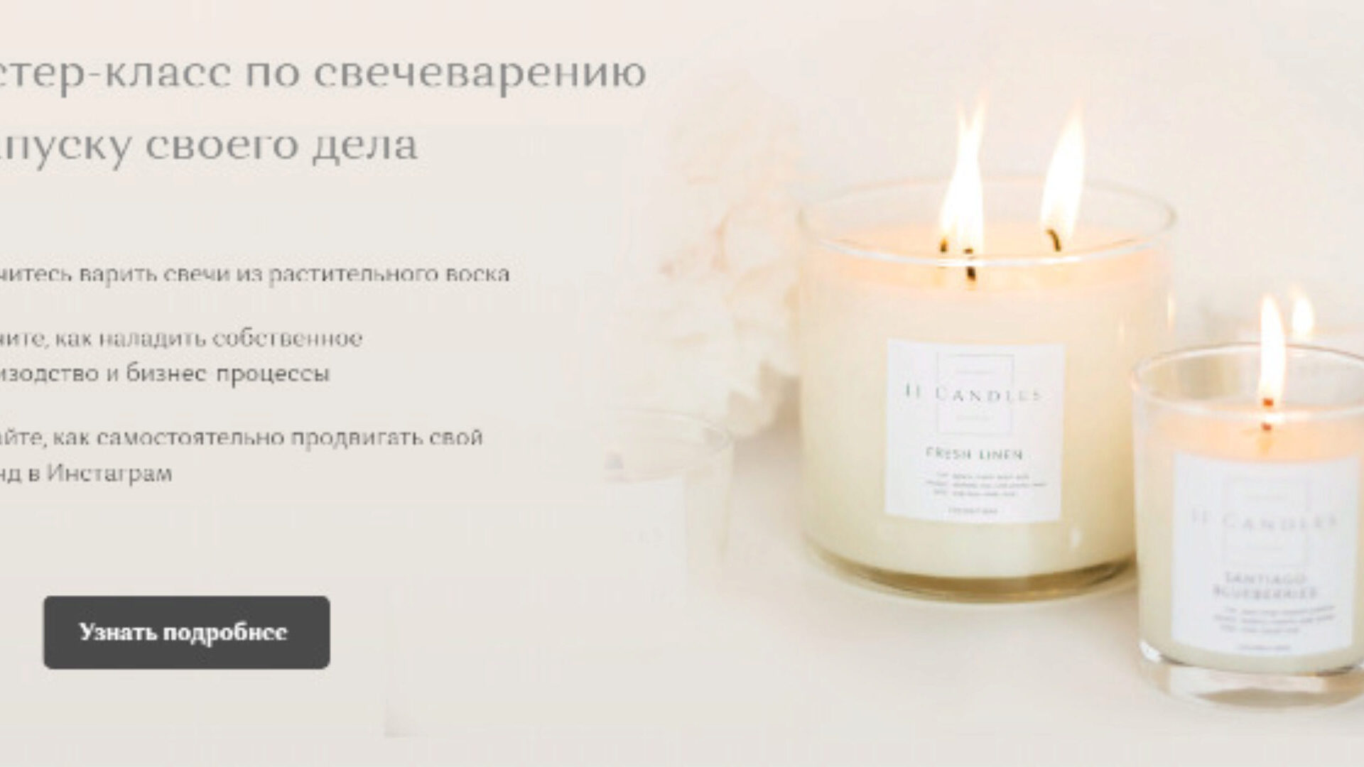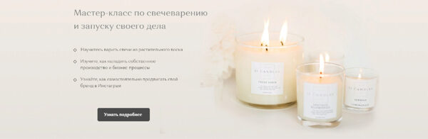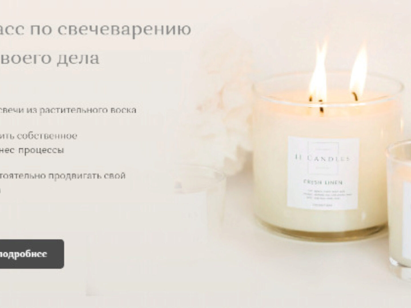 ОБНОВЛЕННАЯ ВЕРСИЯ ЛЕГЕНДАРНОГО МАСТЕР-КЛАССА ПО СВЕЧЕВАРЕНИЮ 2.0! Этот мастер-класс для вас, если вы: мечтаете запустить бизнес, который отражает ваши ценности хотите научиться создавать эко-свечи и зарабатывать на любимом деле уже умеете варить свечи, но вам не хватает знаний и опытного