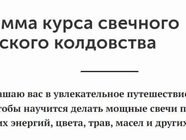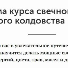 Чему вы научитесь? 1 урок - Стихия Огонь 2 урок - Материалы и ингредиенты 3 урок - 7 популярных рецептов 4 урок - Свеча из вощины 5 урок - Лепная веча 6 урок - Литая свеча 7 урок - Маканая свеча Бонус - Сырая свеча Бонус - Земляная свеча Активация свечи Ритуал на раскрытие дорог Ритуал наполнения