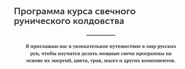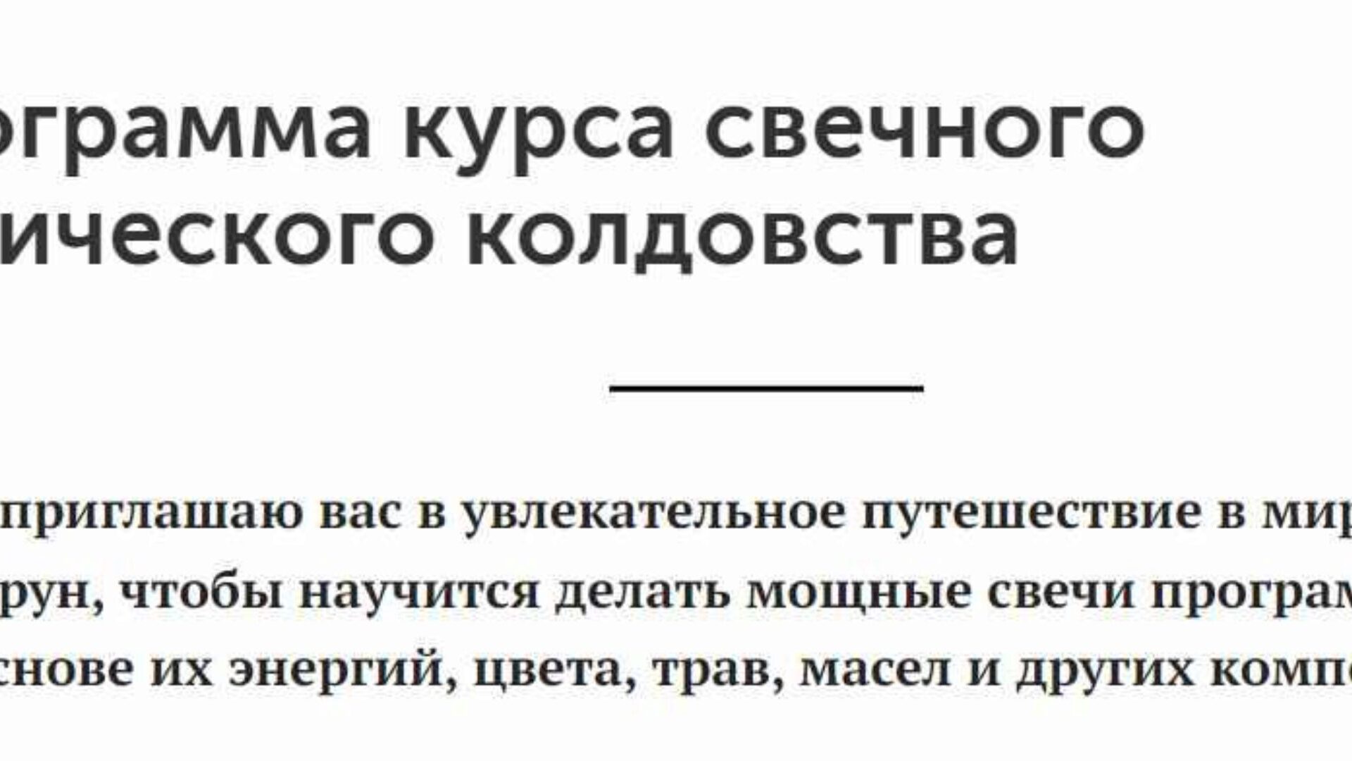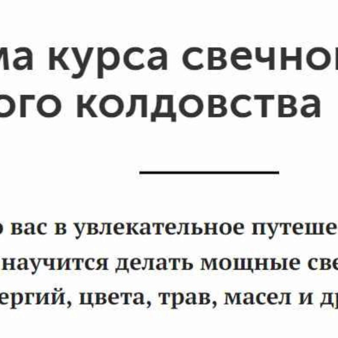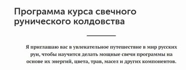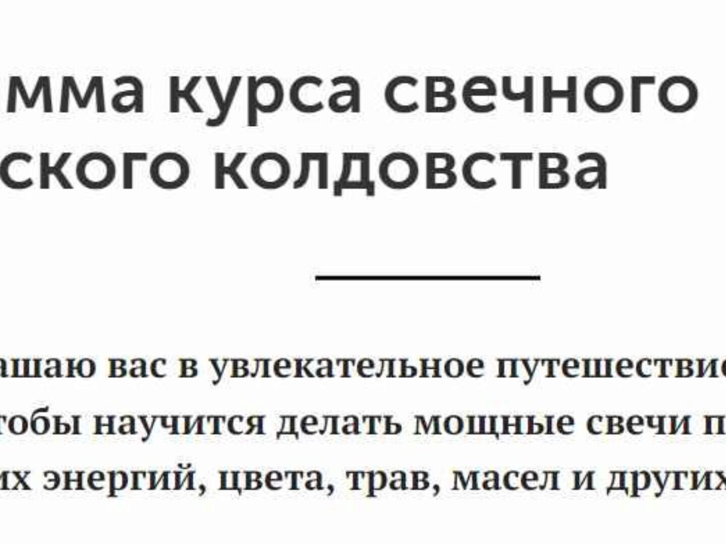 ОПИСАНИЕ КУРСА =================== Практическое деревенское колдовство. Только старинные обряды и рецепты. Чему вы научитесь: - 10 главных ошибок в магии. - Правила и запреты в магии и колдовстве. - Колдовская Книга по языческим традициям - Защита и активация книги специальными знаками - Колдовское