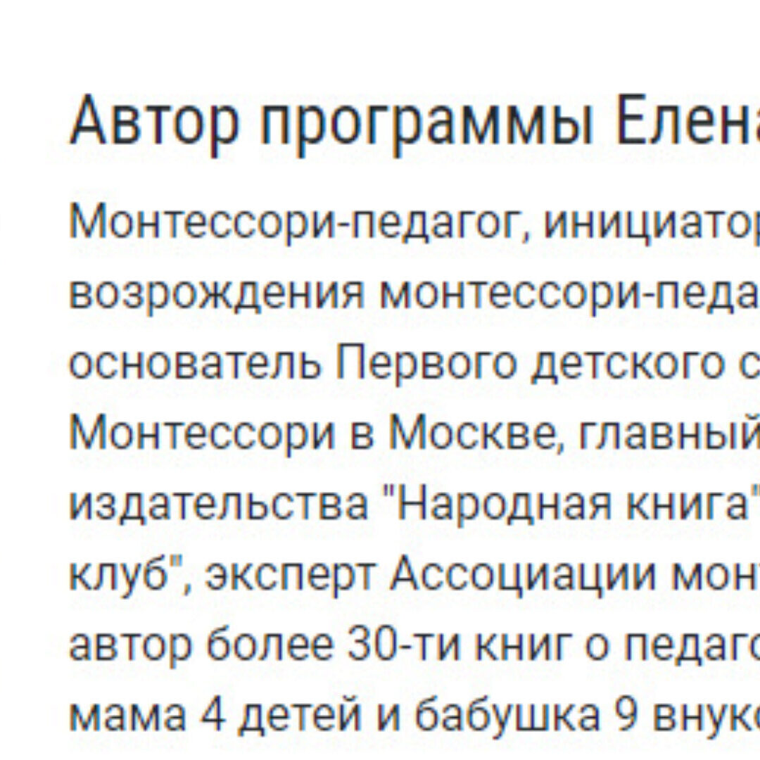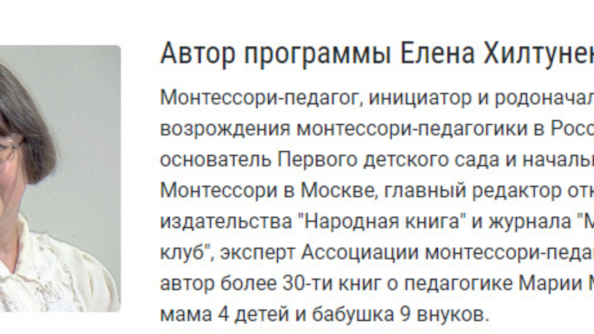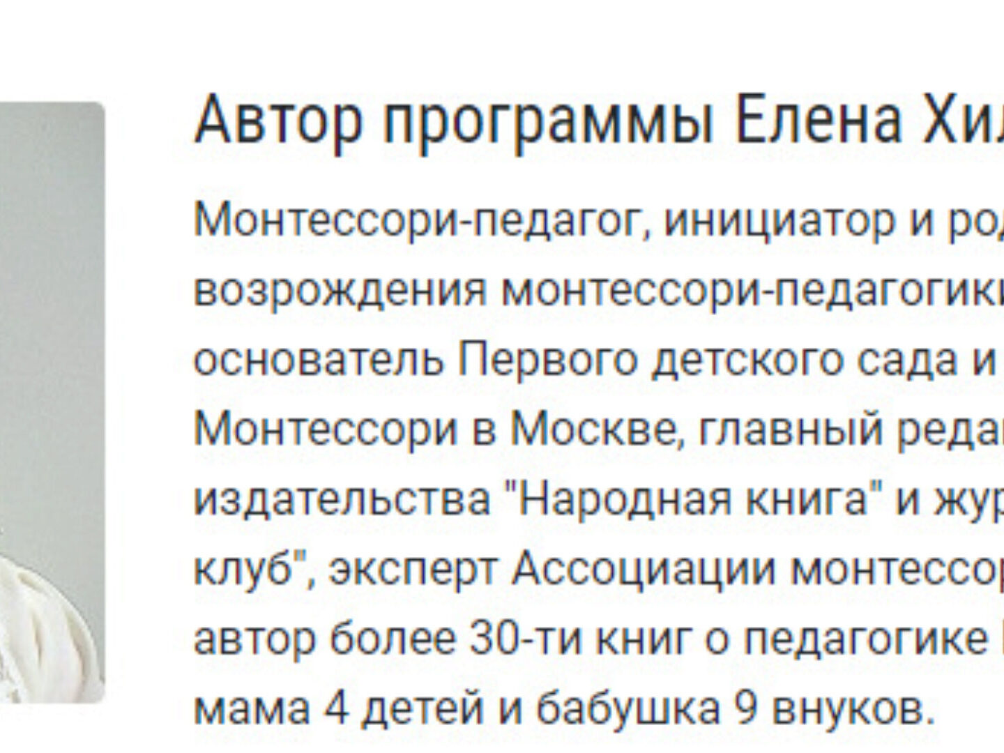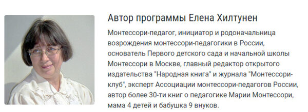 Курс Монтессори-клуб - Монтессори-педагогика для всех, автор Елена Хилтунен. Друзья! Наверное, все понимают: образование человека сейчас на первом месте. Но как разобраться, что подходит именно Вам и Вашим детям? Предлагаем погрузиться в мир педагогики итальянки Марии Монтессори, о которой повсюду так много и противоречиво говорят. Давайте попытаемся вместе узнать, попробовать и, наконец, разобраться в сильных и слабых сторонах этой педагогики. По Вашим многочисленным просьбам мы подготовили онлайн курс из 48 занятий. Теперь у Вас есть возможность подписаться на него, чтобы узнать секреты монтессори-педагогики. Материалы программы приходят на E-Mail и работать с ними можно даже с мобильного телефона.