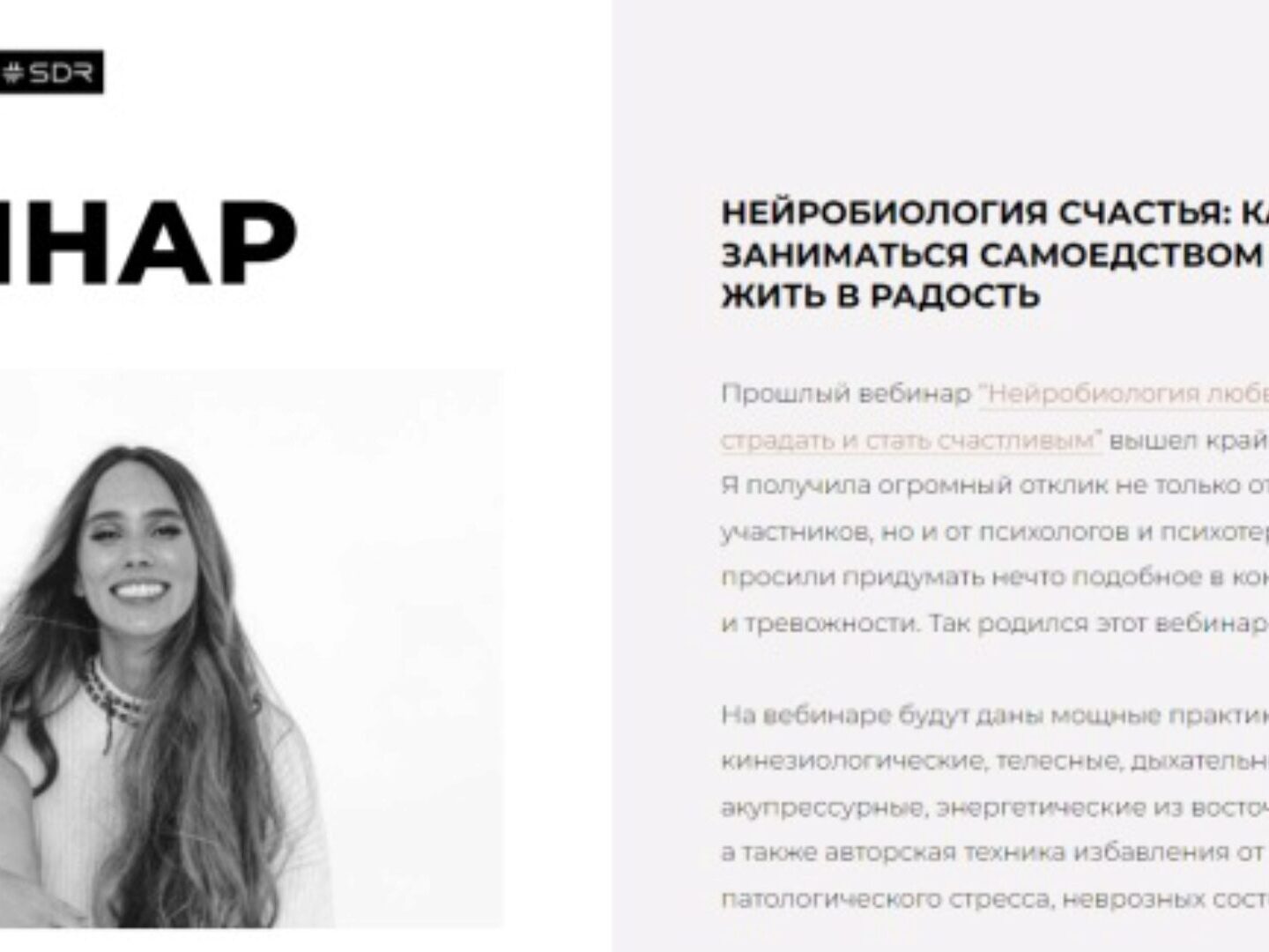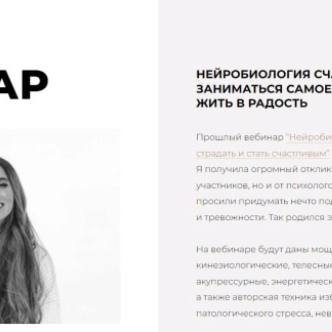 На вебинаре будут даны мощные практики саморегуляции: кинезиологические, телесные, дыхательные, самогипноз, акупрессурные, энергетические из восточных боевых искусств, а также авторская техника избавления от тревожности, патологического стресса, неврозных состояний.
