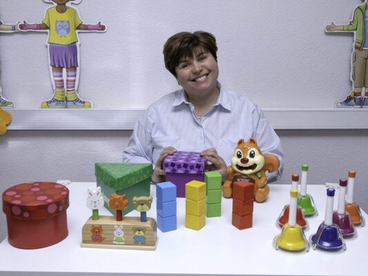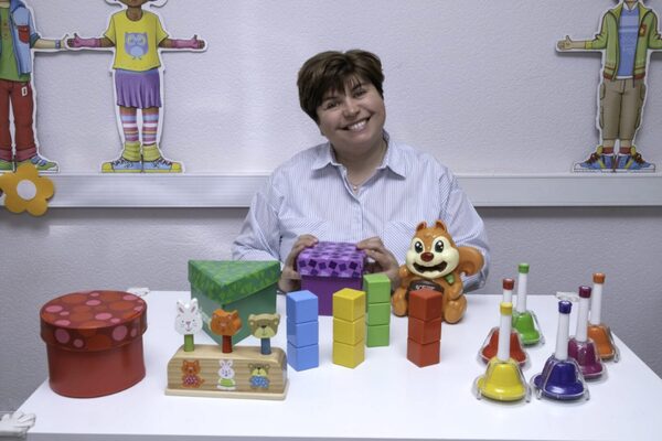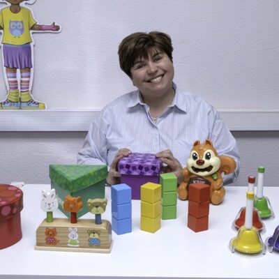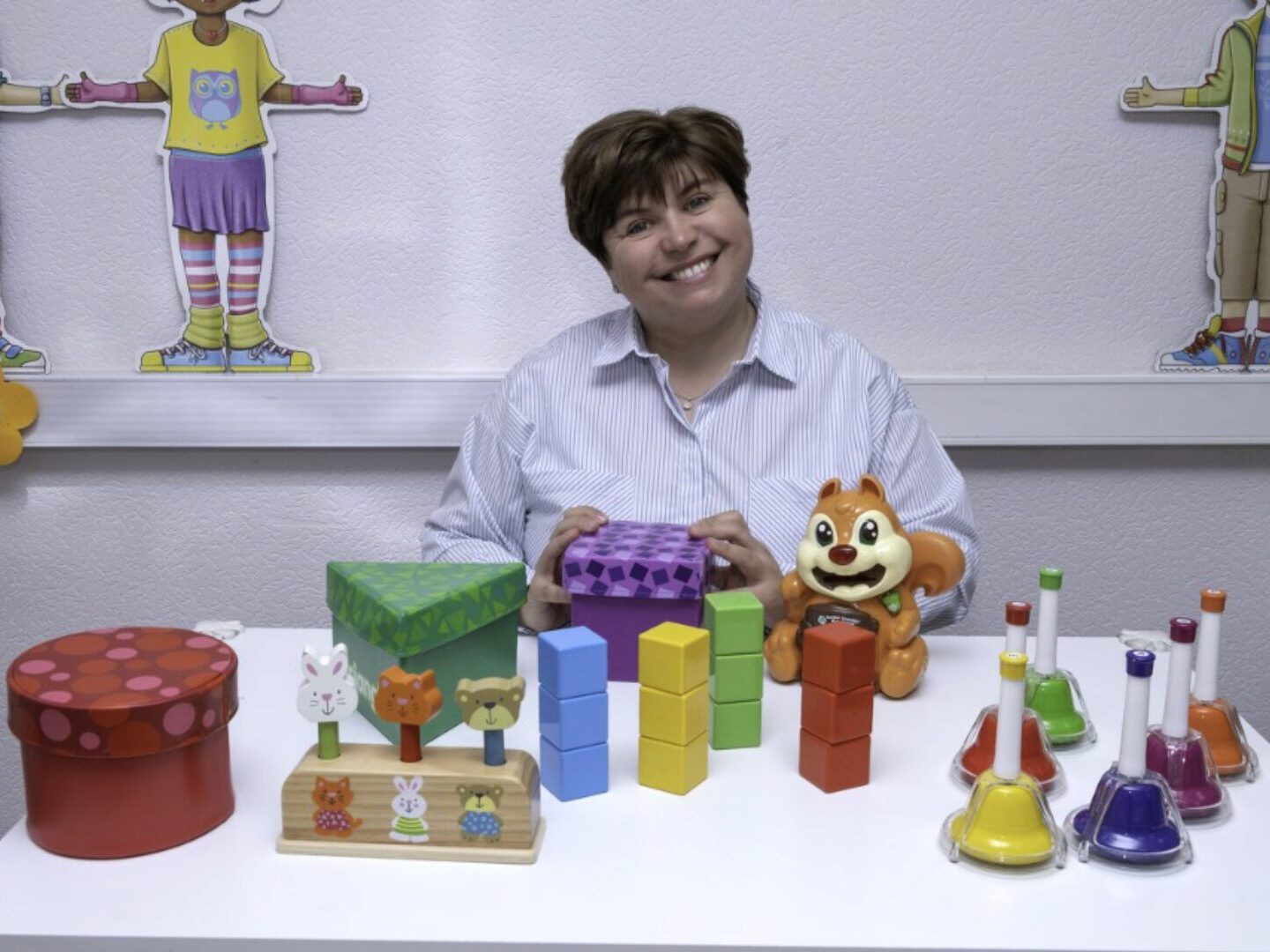 Елена Куликова проигрывает игры и взаимодействует с ребёнком через экран, все игры направлены на развитие мелкой моторики:
