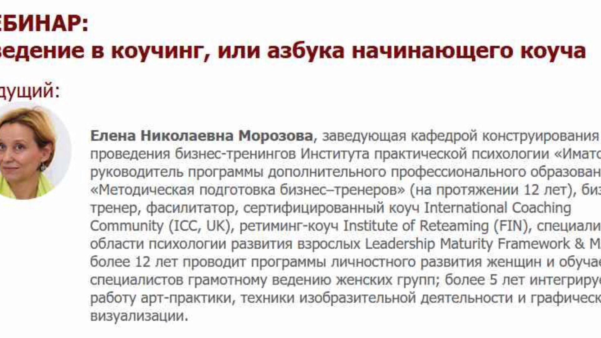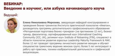 Вебинар адресован начинающим коучам, а также всем, кто интересуется коучингом как инструментом для решения личных и профессиональных задач.