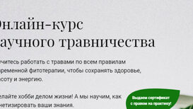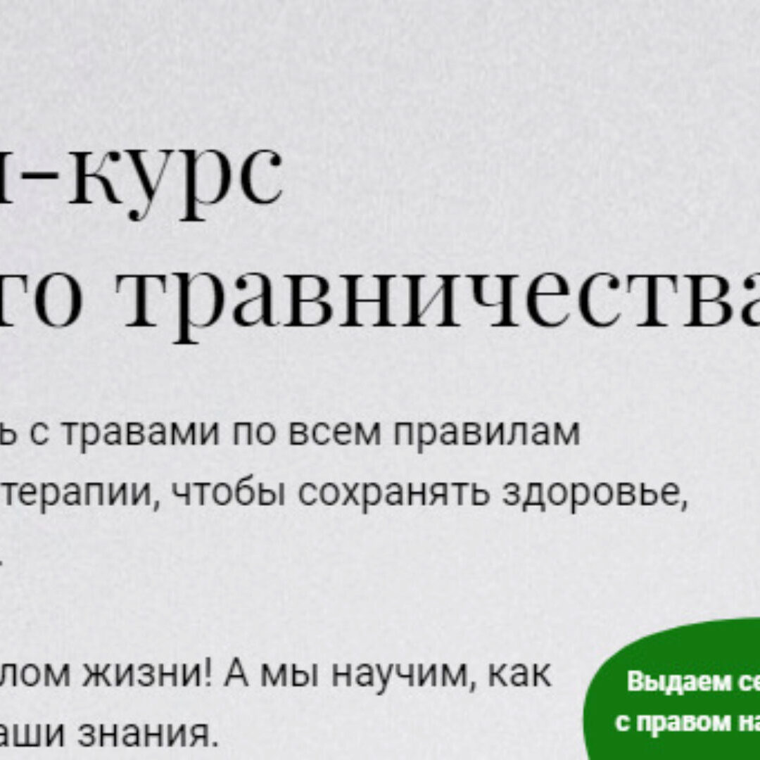 Курс построен на свежих мировых исследованиях в фитотерапии Учитесь в любое время: онлайн-лекции + их записи Рецепты домашних средств Что дает курс? Вы научитесь Составлять сборы под ваши цели по нескольким алгоритмам Определять, какие травы сочетаются, а какие мешают друг другу Рассчитывать по
