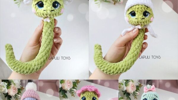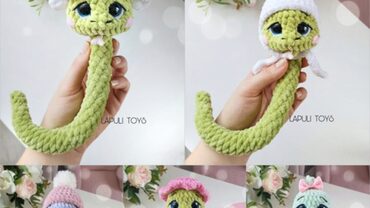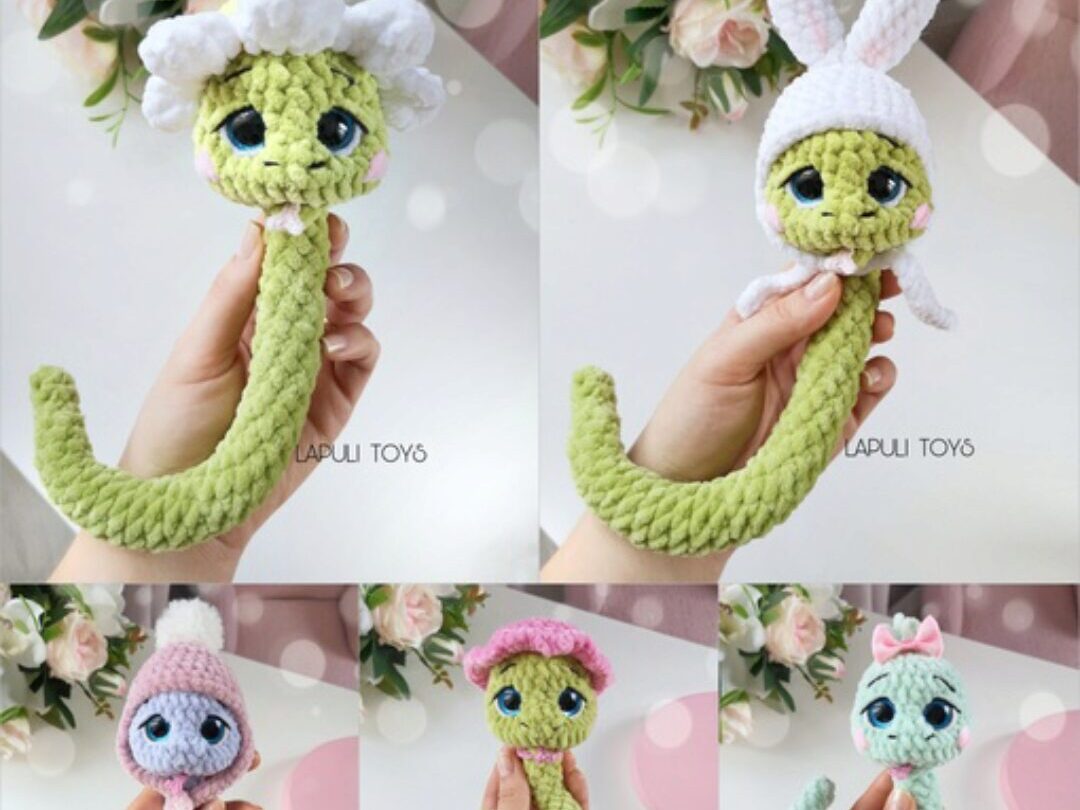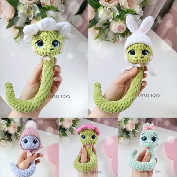 В мк входят: описание вязания самой змеи и 4 вида головных убора на нее.