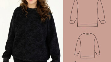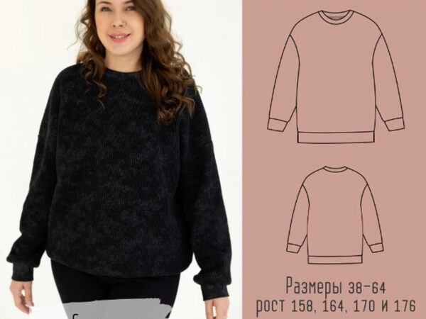 Толстовка/свитшот свободного кроя, прямого силуэта, спущенное плечо. Три варианта обработки горловины – одношовный капюшон, воротник стойка, либо обтачкой из рибаны с лайкрой/кашкорсе. В комплект входят файлы для печати на А4 и плоттере.