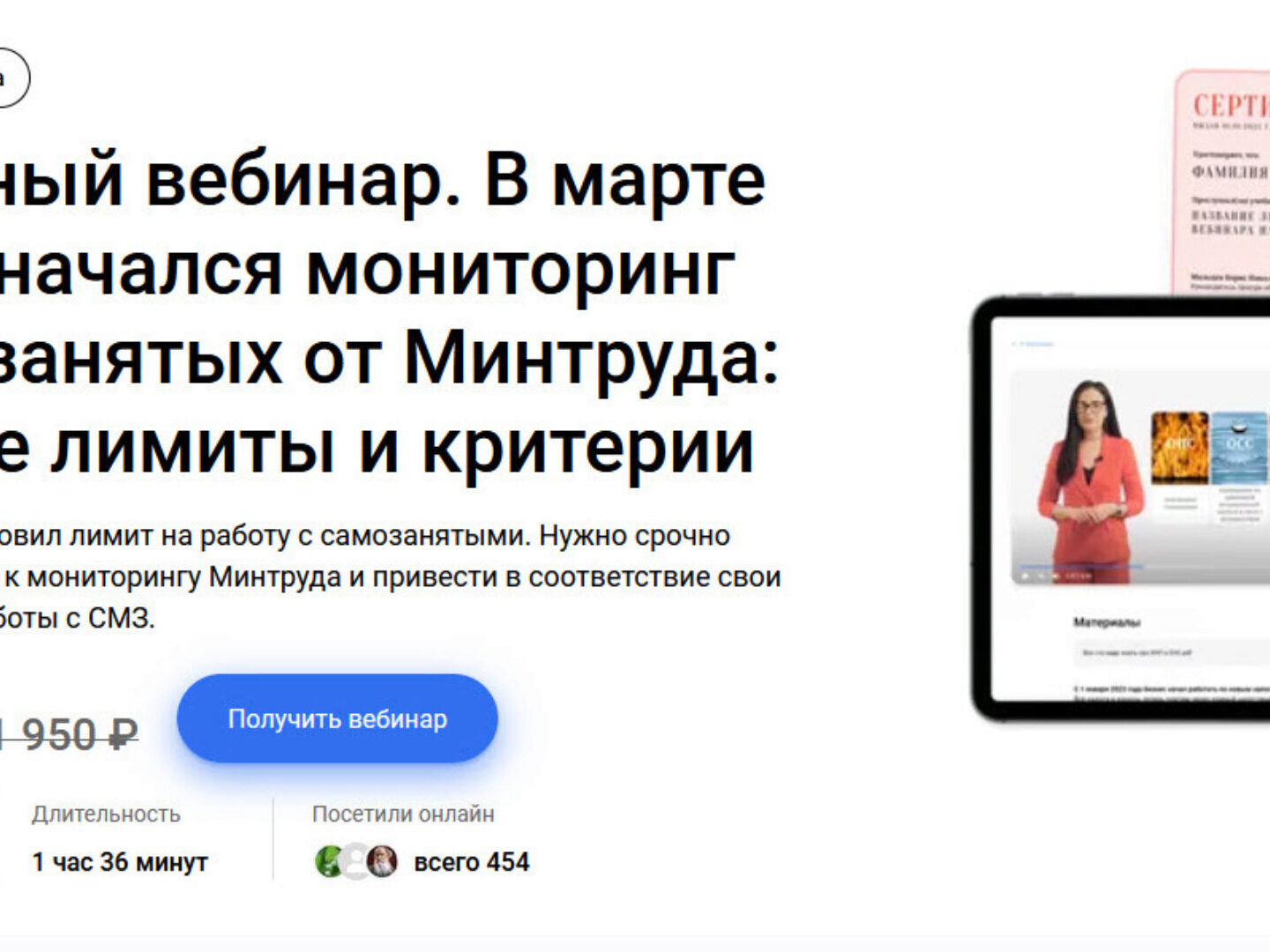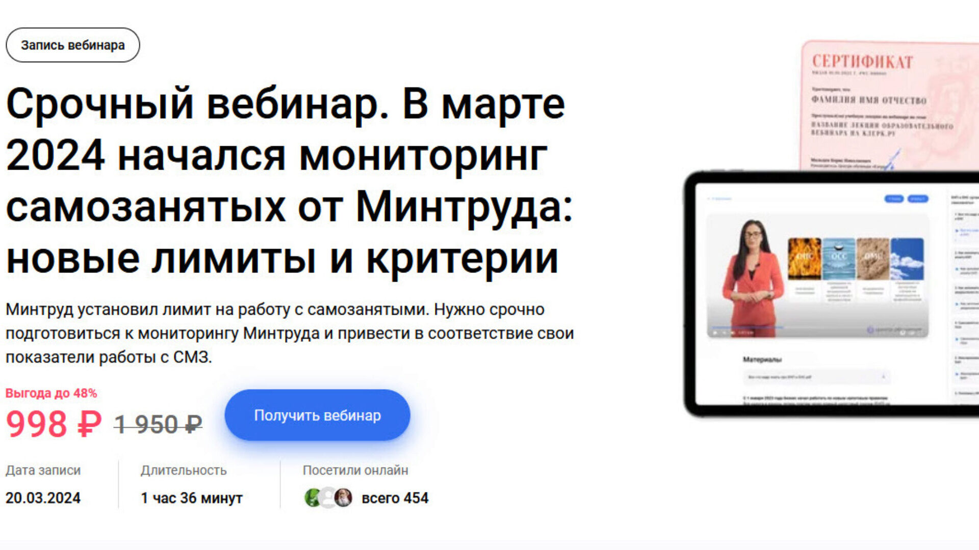 Почему курс «Срочный вебинар. В марте 2024 начался мониторинг самозанятых от Минтруда» стоит всего 1110 ₽?