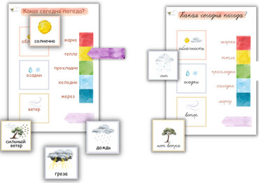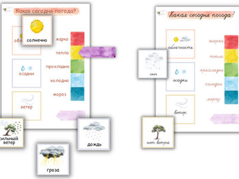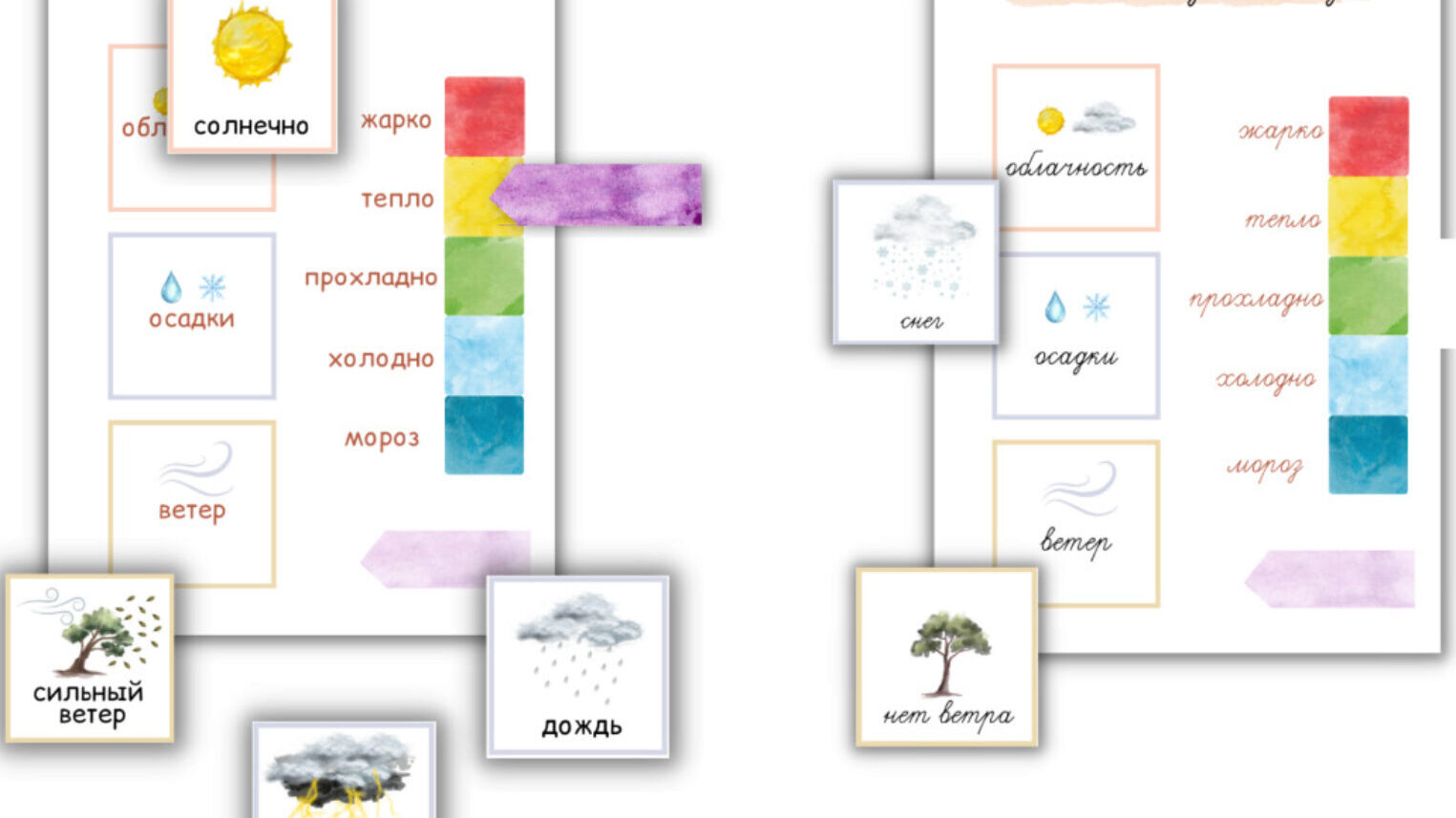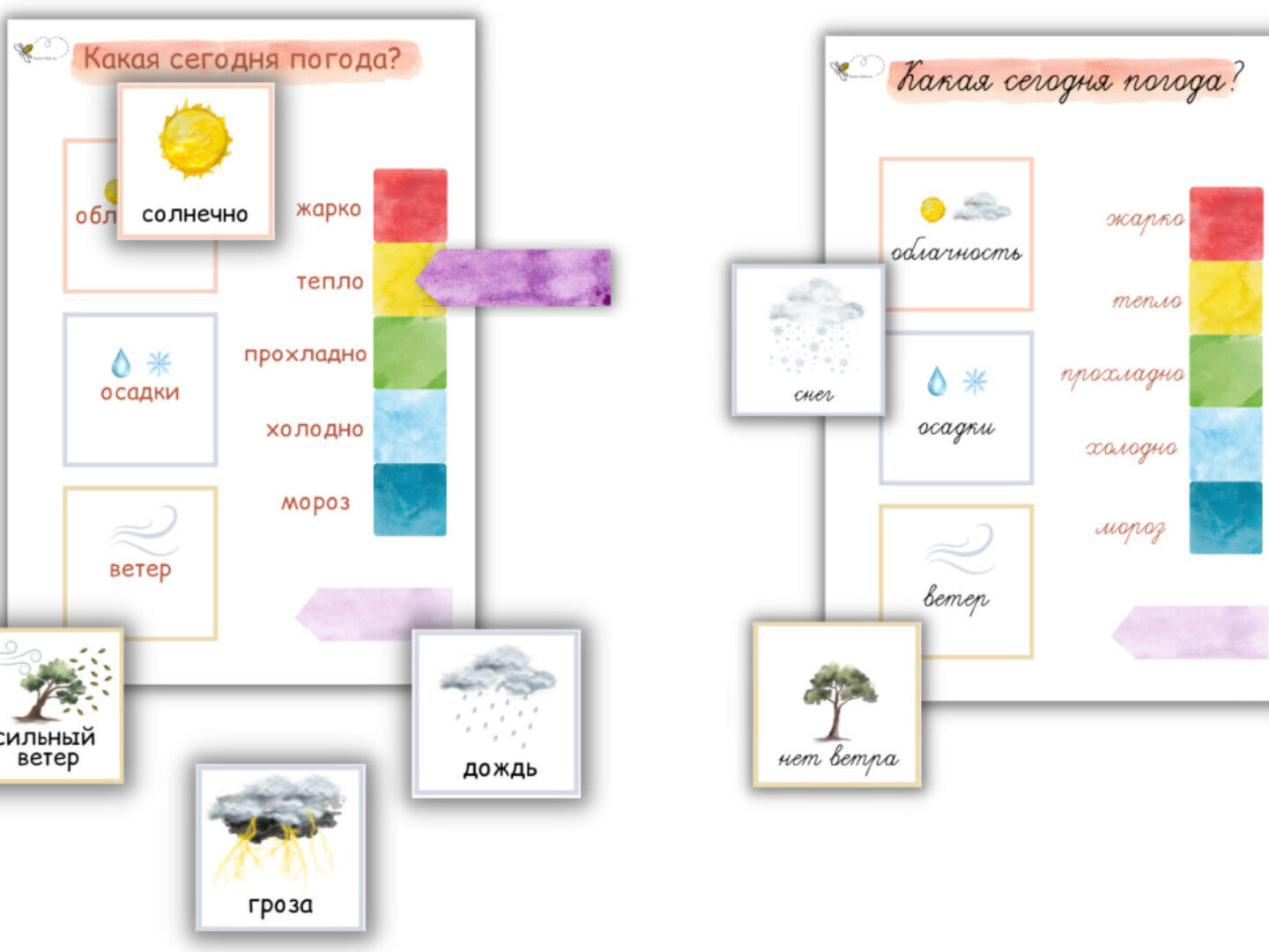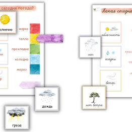 В набор входят календарь формата А4 и 14 карточек с осадками, ветрами и облачностью и инструкция