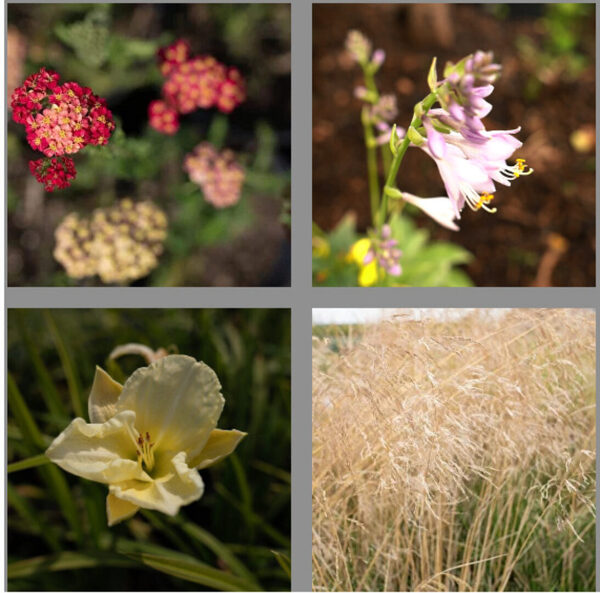 Синюха, рудбекия, гелениум, примула, шалфей, иссоп, перовския, тимьян, вероника, вероникаструм, ясколка, печеночница, нивянник, пиретрум, калимерис, мордовник, синеголовник, ацена, живучка, кислица, манжетка, полынь, будра, гейхера, тиарелла, гейхерелла, хоста