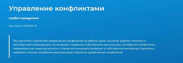 На курсе «Управление конфликтами» Вы рассмотрите конфликты с объективной, управленческой точки зрения, Вы поймете их происхождение, научитесь распознавать факторы, лежащие в основе конфликтов, и в конечном итоге - управлять ими.
