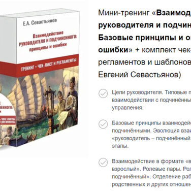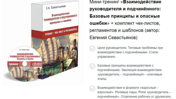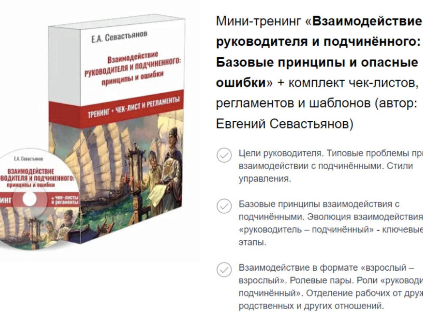- Тренинг Евгения Севастьянова «Взаимодействие и отношения руководителя и подчинённого: Базовые принципы и опасные ошибки» (2,5 часа видео) + аудио-версия в формате mp3 для тех, кто предпочитает слушать в машине или во время занятия спортом.