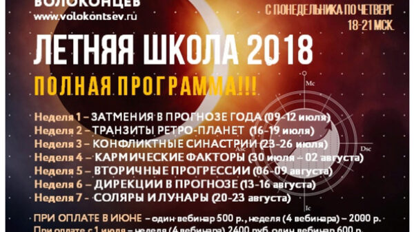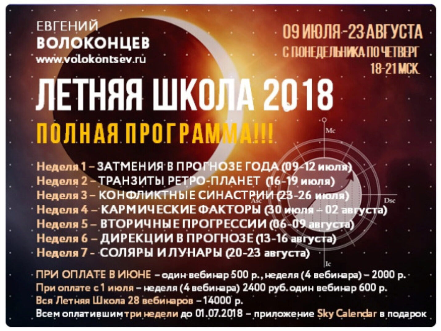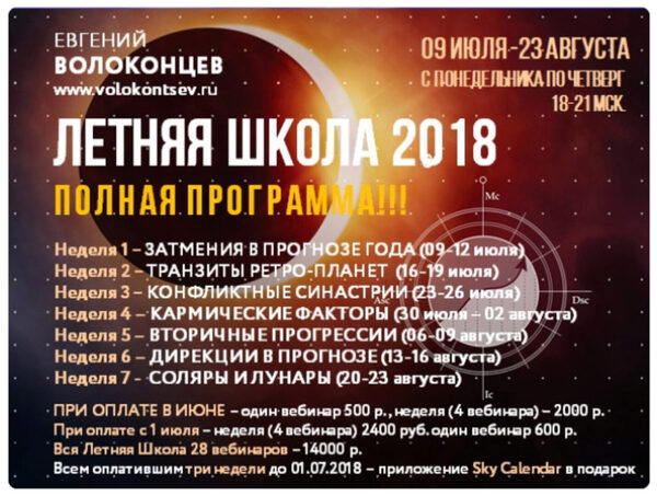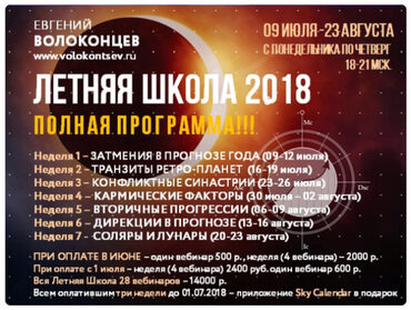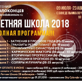 «Основы астрологического прогнозирования. Соляры (метод солнечных возвращений)» Курс состоит из 3-х вебинаров (продолжительность каждого вебинара - 3 часа) Первый вебинар состоится во вторник 22 мая 2018 г. в 19:30 мск. Видео-анонс Цена 2500 руб.