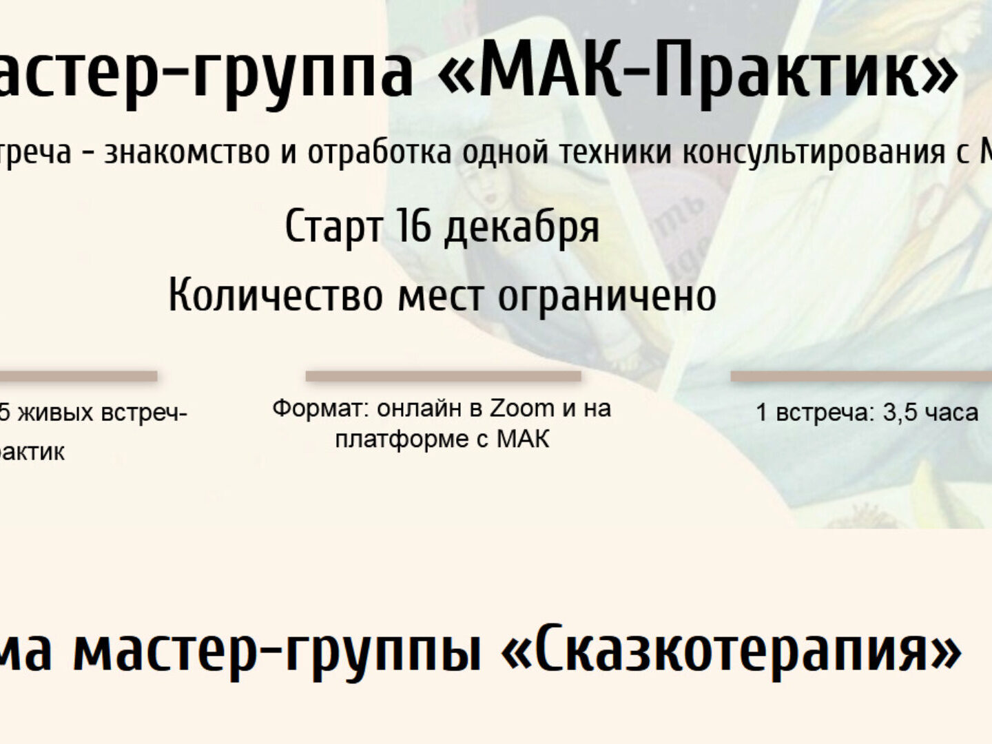 - МАК и сказкотерапия отлично сочетаются друг с другом, так как в основе этих методов лежат метафора, ассоциация, проекция.