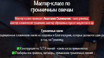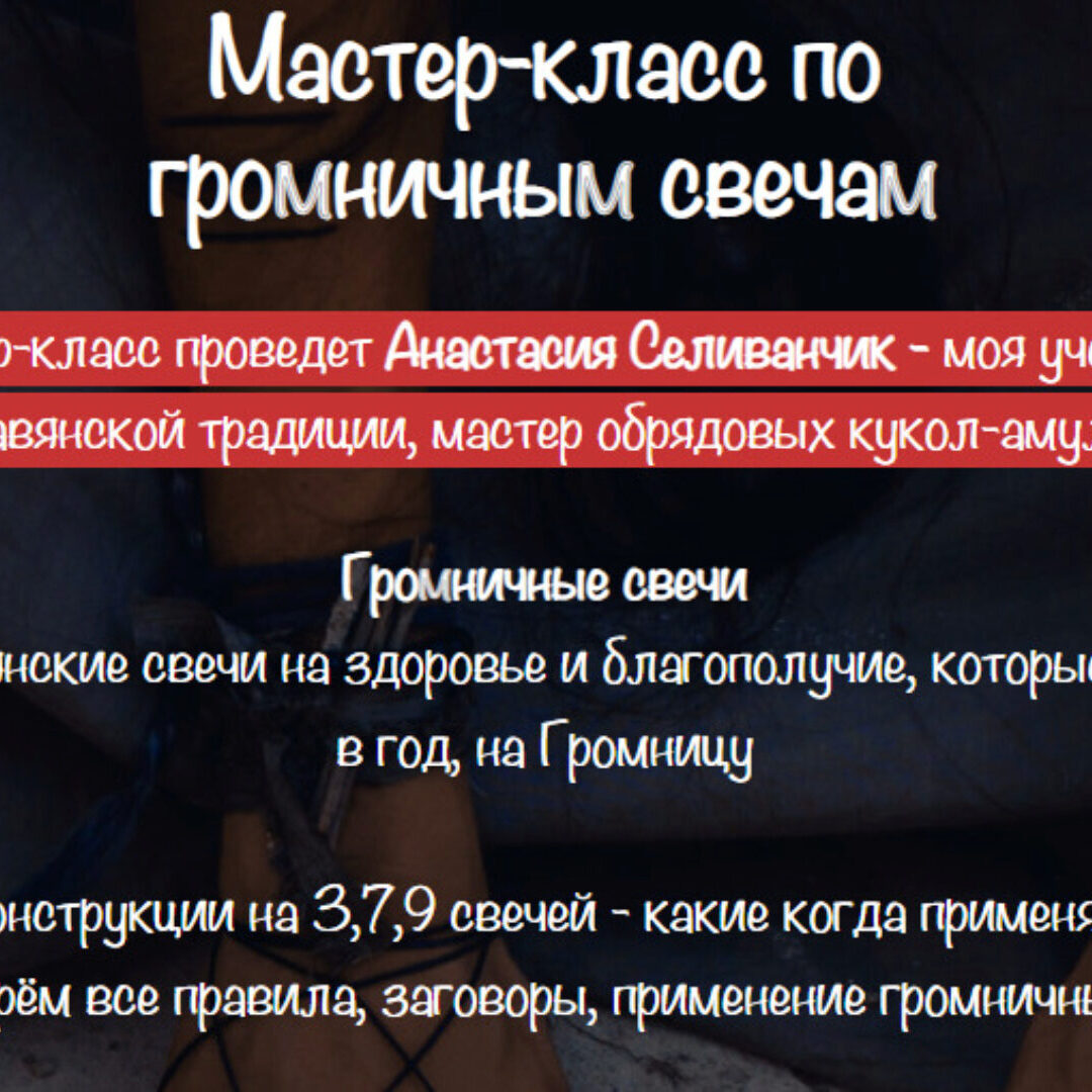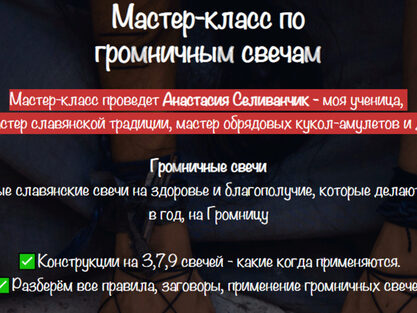 Вы получите запись занятия от 2 февраля 2018 года. Для занятия необходимо подготовить: воск или несколько листов вощины, посуду, в которой будете плавить воск, масла и травы, формы для свечей, х/б нити для фитиля. Занятие для тех, кто: хочет узнать больше о свечной магии, хоть как-то знаком с темой