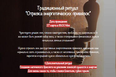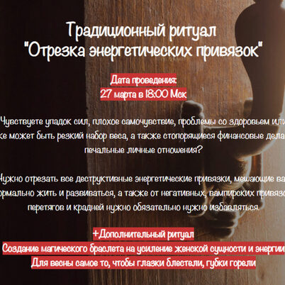 Традиционный ритуал «Отрезка энергетических привязок» Чувствуете упадок сил, плохое самочувствие, проблемы со здоровьем или же может быть резкий набор веса, а также стопорящиеся финансовые дела и печальные личные отношения? Нужно отрезать все деструктивные энергетические привязки, мешающие вам