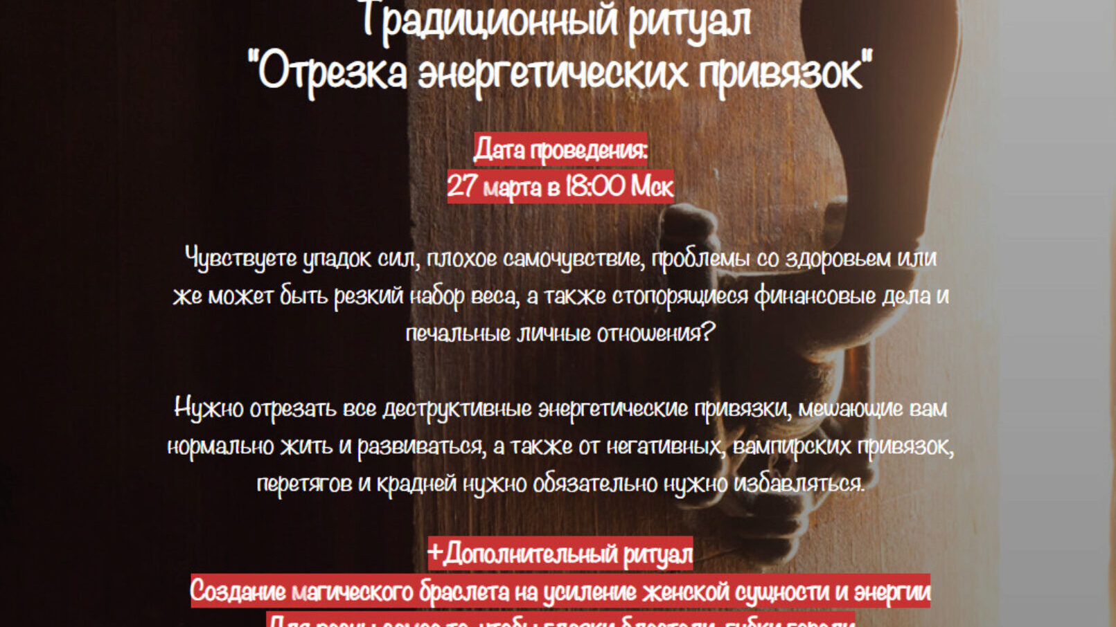 Чувствуете упадок сил, плохое самочувствие, проблемы со здоровьем или же может быть резкий набор веса, а также стопорящиеся финансовые дела и печальные личные отношения? Нужно отрезать все деструктивные энергетические привязки, мешающие вам нормально жить и развиваться, а также от негативных,