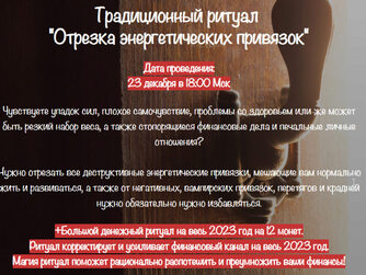 Приглашаю вас совершить традиционный ритуал «Отрезки негативных энергетических привязок» Мы с вами его уже делаем уже более полугода, ритуал имеет накопительный эффект, поэтому его нужно повторять, хотя бы раз в месяц. Сделаем как всегда на сильном круге на моей и вашей силе +Дополнительный ритуал