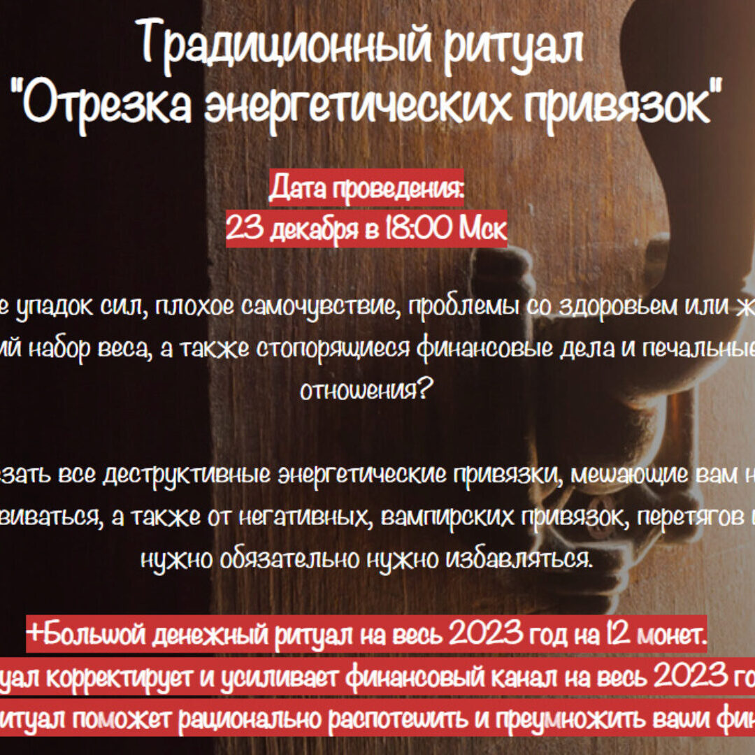 Традиционный ритуал «Отрезка энергетических привязок» Чувствуете упадок сил, плохое самочувствие, проблемы со здоровьем или же может быть резкий набор веса, а также стопорящиеся финансовые дела и печальные личные отношения? Нужно отрезать все деструктивные энергетические привязки, мешающие вам