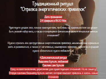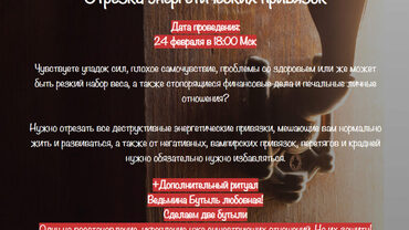 Чувствуете упадок сил, плохое самочувствие, проблемы со здоровьем или же может быть резкий набор веса, а также стопорящиеся финансовые дела и печальные личные отношения? Нужно отрезать все деструктивные энергетические привязки, мешающие вам нормально жить и развиваться, а также от негативных,