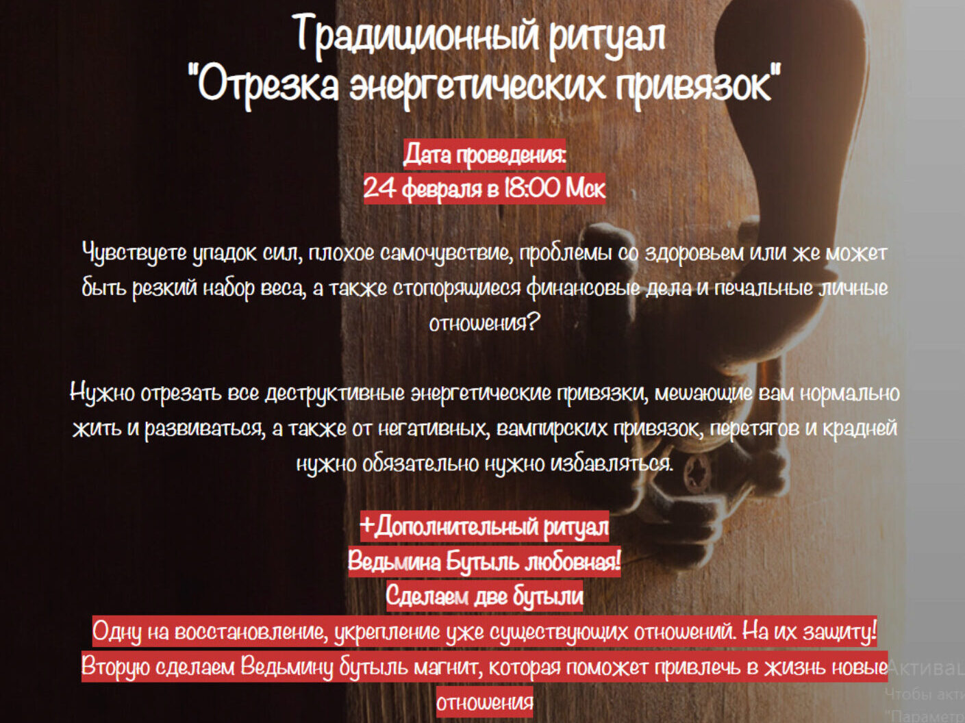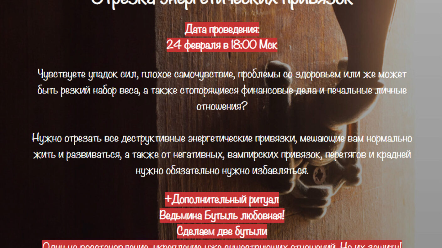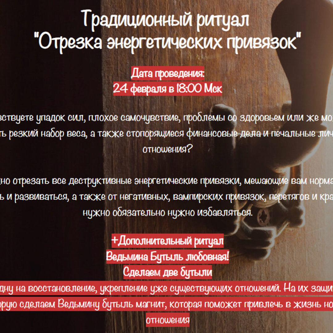 Традиционный ритуал «Отрезка энергетических привязок» Чувствуете упадок сил, плохое самочувствие, проблемы со здоровьем или же может быть резкий набор веса, а также стопорящиеся финансовые дела и печальные личные отношения? Нужно отрезать все деструктивные энергетические привязки, мешающие вам