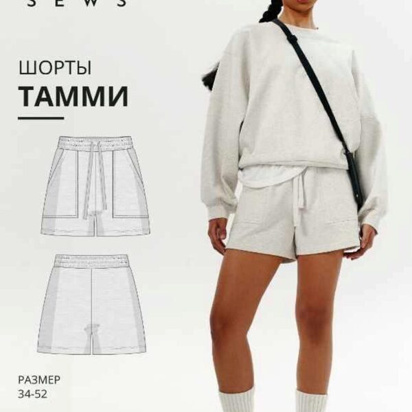 Выкройка шорт прямого силуэта, среднего объема. Пояс шорт – притачной, на резинке. На передних половинках шорт расположены накладные карманы. По карманам и низу изделия проложена декоративная строчка. Длина до середины бедра. Модель Софья: Рост 172, ОГ 84, ОТ 64, ОБ 90. Выбранный размер 36,