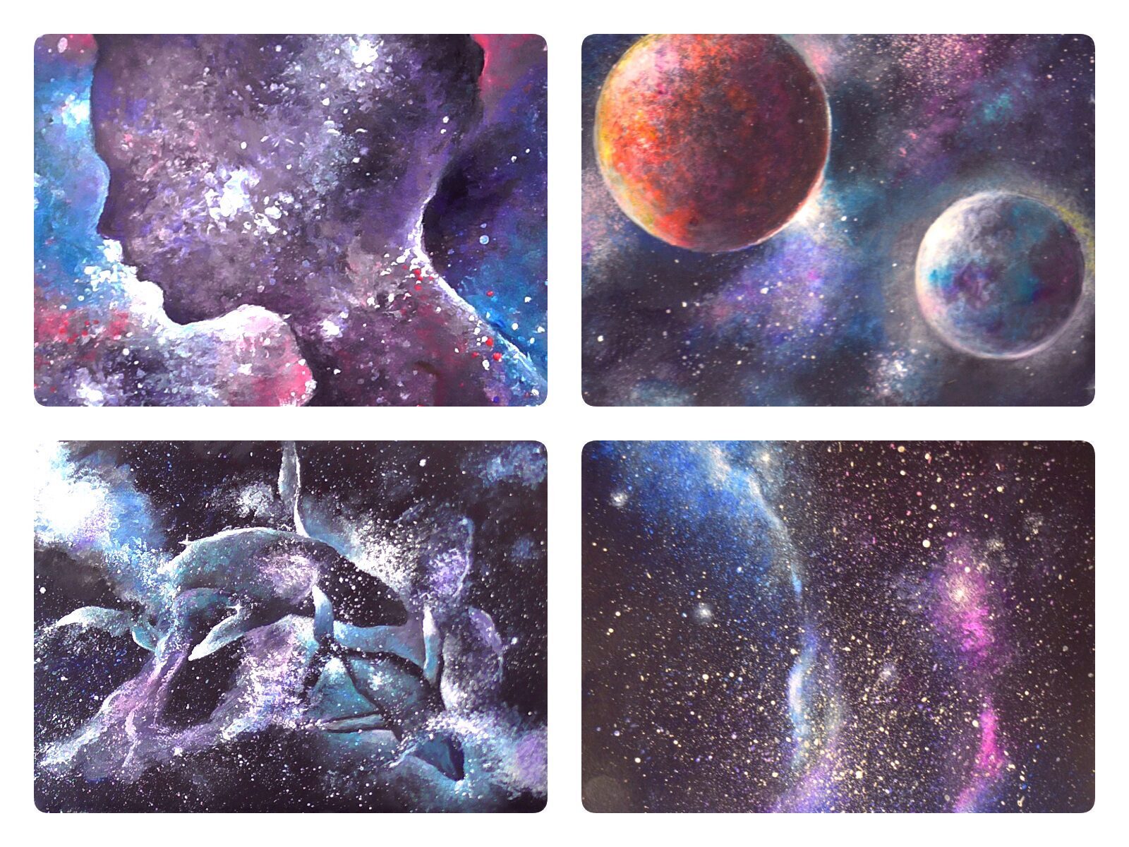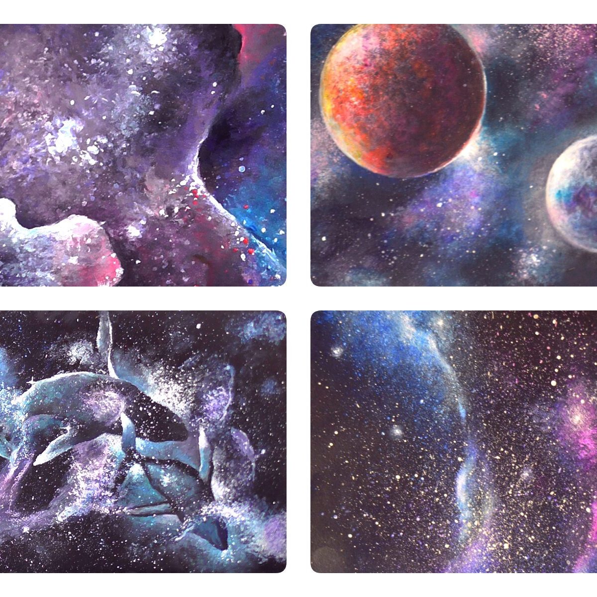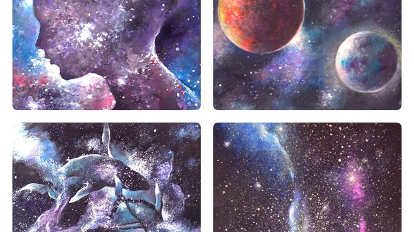 Он поможет развить наш базовый метод работы на чёрном фоне и покажет способ создания планет, туманностей, звёзд с лучами и ореолами. Здесь мы также знакомимся с акварельными возможностями акрила и изучаем композицию. Рисуем картину с двумя планетами и звёздами.