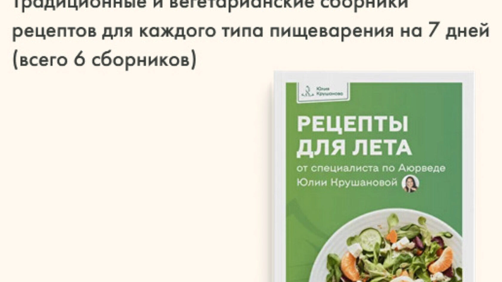 Всего будет 6 сборников меню. Из них каждое на один из трех типов пищеварения: вишама агни, манда агни или тикшна агни. Для отдельного типа пищеварения два варианта меню: традиционное и вегетарианское.