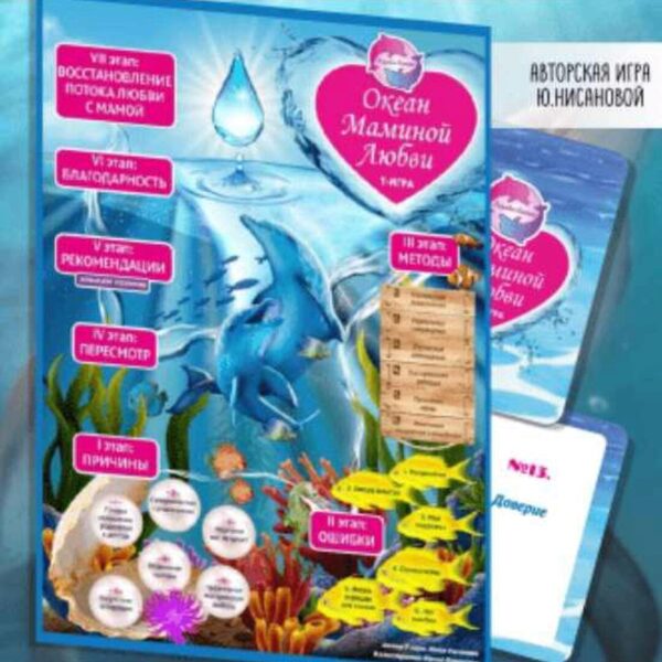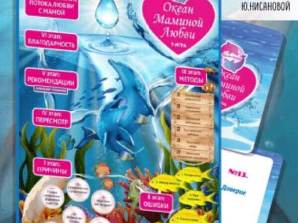 Автор: Юлия Нисанова (психолог, сертифицированный специалист по ЭОТ и работе с МАК, автор психологической игры «Океан маминой любви», обучающий тренер школы игропрактики «Игры Жизни».) Комплектация: игровое поле формат А1 (61х82 см); игровой кубик на 6 граней; инструкция с описанием игры; папка А4;