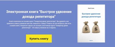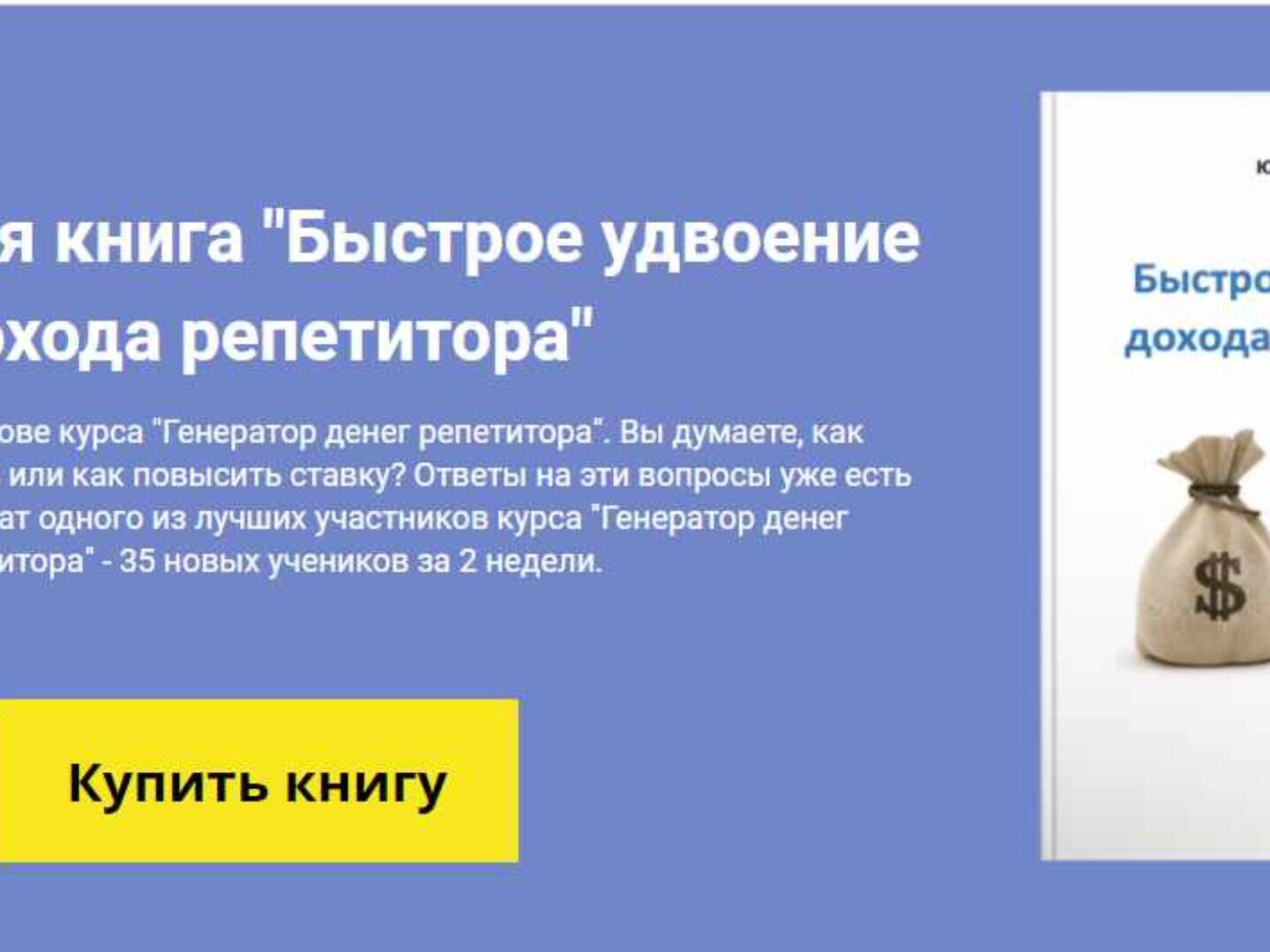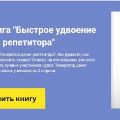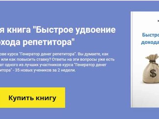 Книга написана на основе курса «Генератор денег репетитора». Вы думаете, как привлечь новых учеников или как повысить ставку? Ответы на эти вопросы уже есть в моей книге. Результат одного из лучших участников курса «Генератор денег репетитора» - 35 новых учеников за 2 недели.