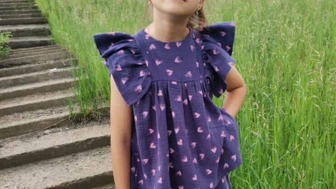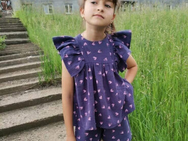 Комплект с трусиками — блумерами, которые удобно сидят на подгузнике и не стесняют движений. Туника с застежкой по спинке, крылышками на лямках. Ниже линии груди начинается отрезная юбка со сборкой. В выкройке предусмотрены два варианта длины верха — туника или платье. Длина резинки для трусиков в