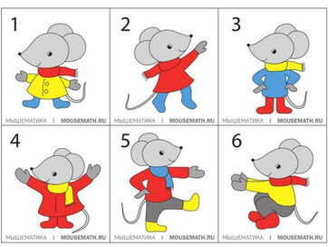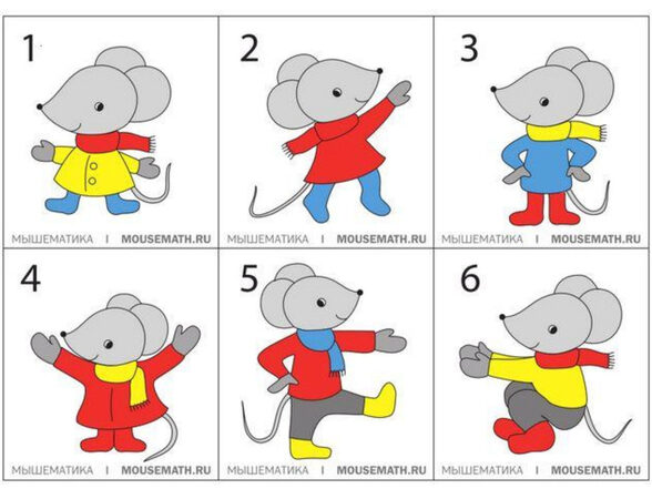 А можно искать мышек, которые отличаются только цветом одной одежды. Например, мышки 10 и 12 имеют сапоги одного цвета, а куртку и шарф надо поменять местами.