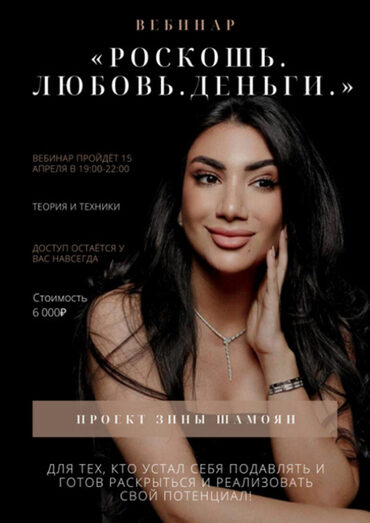 По вашим многочисленным просьбам! долгожданный вебинар Зины Шамоян «Разреши себе деньги и изобилие» Если женщина не получает столько денег и изобилия, сколько ей нужно, в чем может быть главная причина? Конечно, часто можно получить ответ: - Нет времени; - Нет подходящей работы; - Много сил уходит
