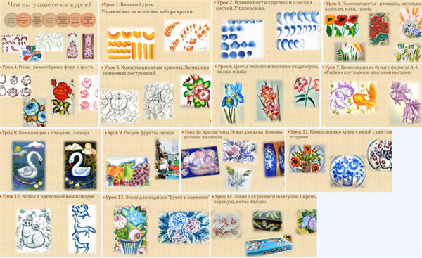 Чему обучают на курсе: Подбирать и подготавливать материалы для росписи: краски, кисти, лаки, заготовки. Правильной постановке руки и работе с кистями для росписи. Изображению базовых приемов работы с красками и кистями. Написанию цветов, листьев, травинок и других элементов росписи, изящных